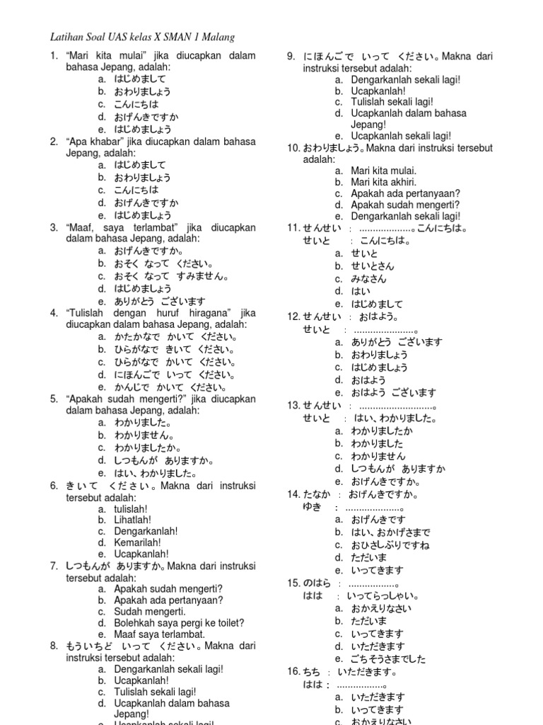 Page 2 Sman 81 Jakarta from sman81jkt.sch.id Bahasa madura online worksheet for 8. Kata yang diucapkan setelah memperkenalkan diri. Yahhooooo minasan para pemelajar bahasa jepang dimanapun! Daftar film romantis jepang terbaik. 100+ soal uas/pat bahasa inggris kelas 10 semester 2 kurikulum 2013. Sebagai persiapan menghadapai ulangan kenaikan kelas berikut adnib iguru31 sediakan soal latihan. Soal soal bahasa jepang untuk latihan sesmester 2 kelas xifull description. Waktu yang di berikan adalah 60 menit untuk mengerjakan soal tersebut.